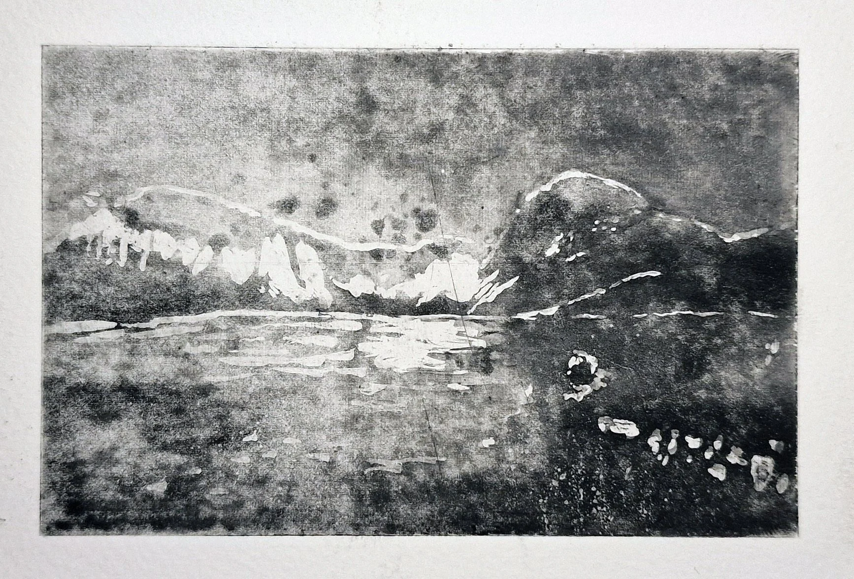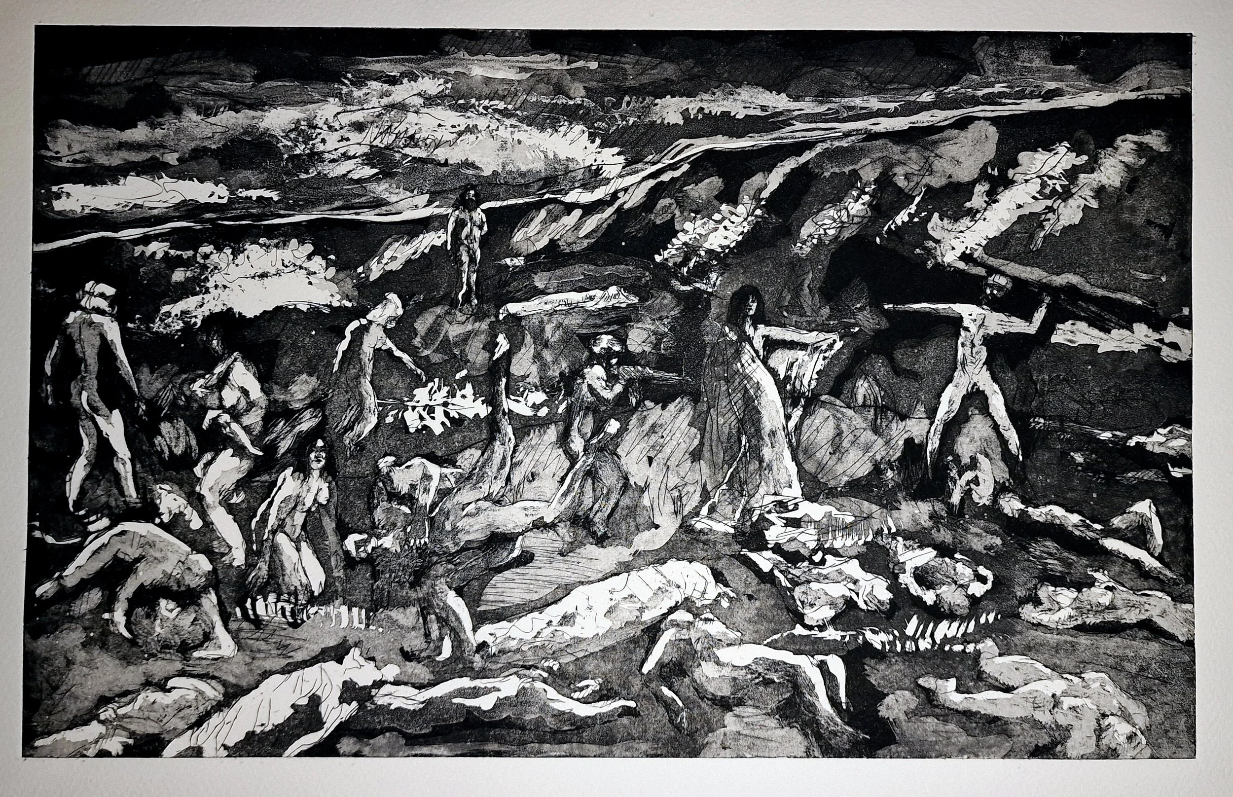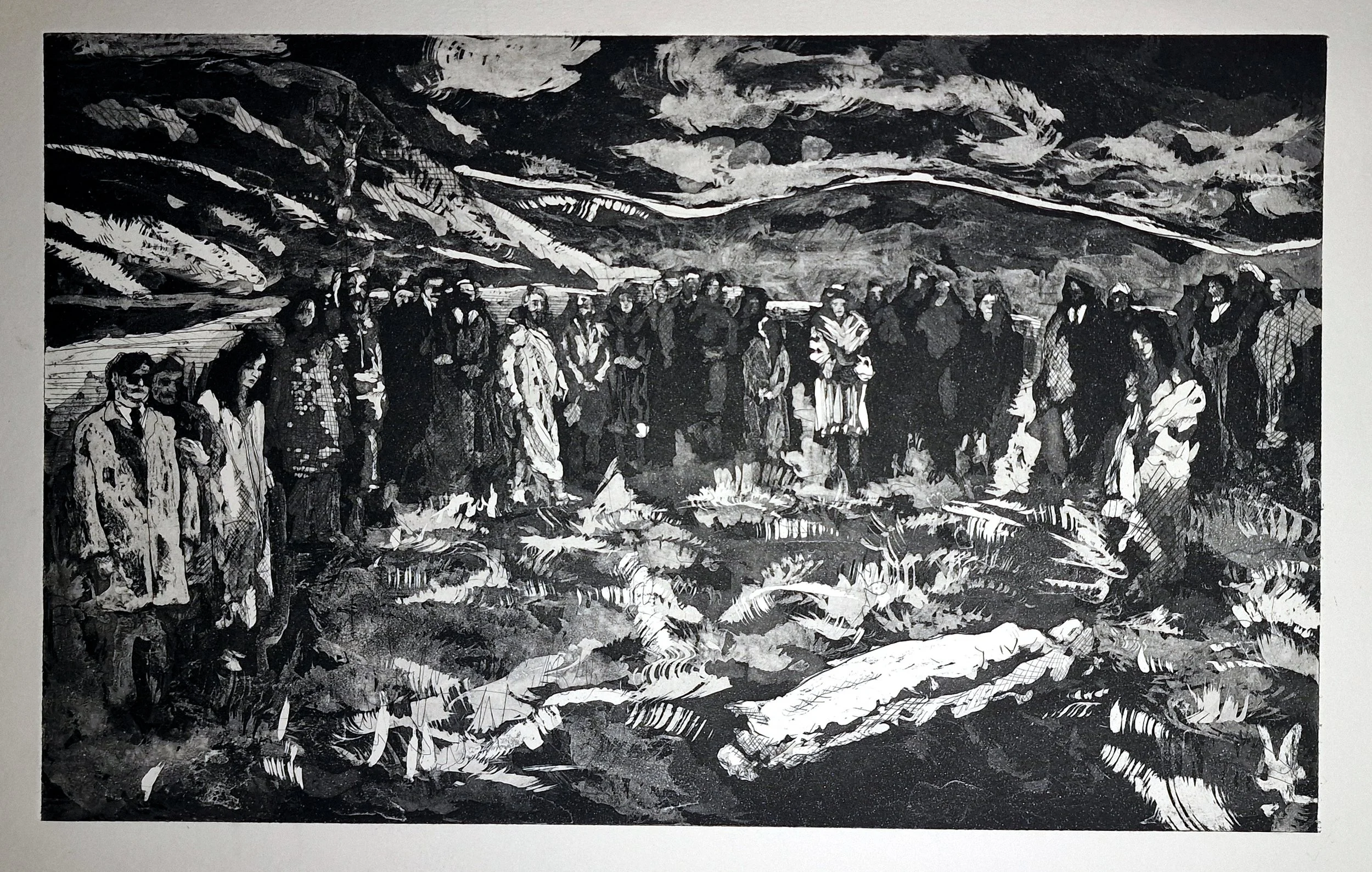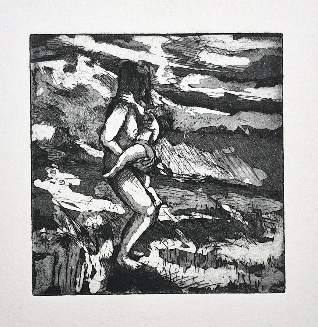 These works form an earlier stage in my practice, developed through etching, aquatint and painting. They explore fragmented figures, collective presence, and constructed landscapes—ideas that continue into my current work. Printmaking provided a way of building images through layers, erosion, and reconstruction, establishing a visual language that now informs my painting.